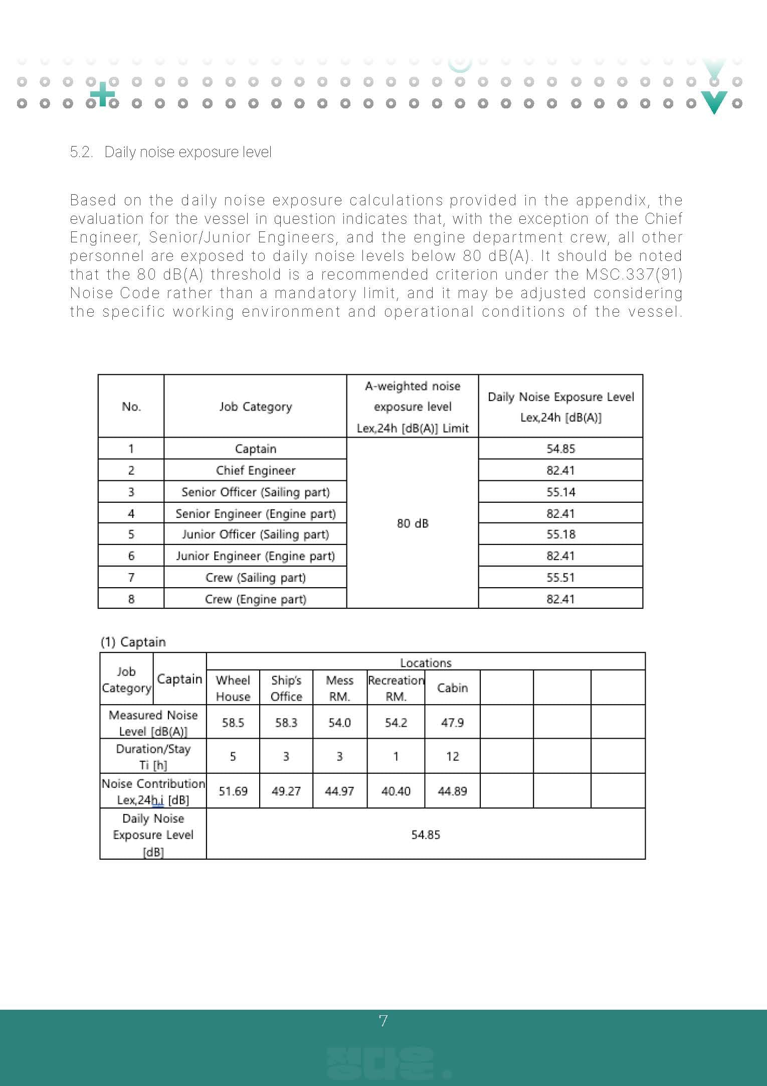 - 노출 레벨 계산: 선원들의 직무별 체류 시간 정보를 바탕으로 '일일 소음 노출 레벨(Daily Noise Exposure)'을 계산하여 최종 보고서에 포함합니다.